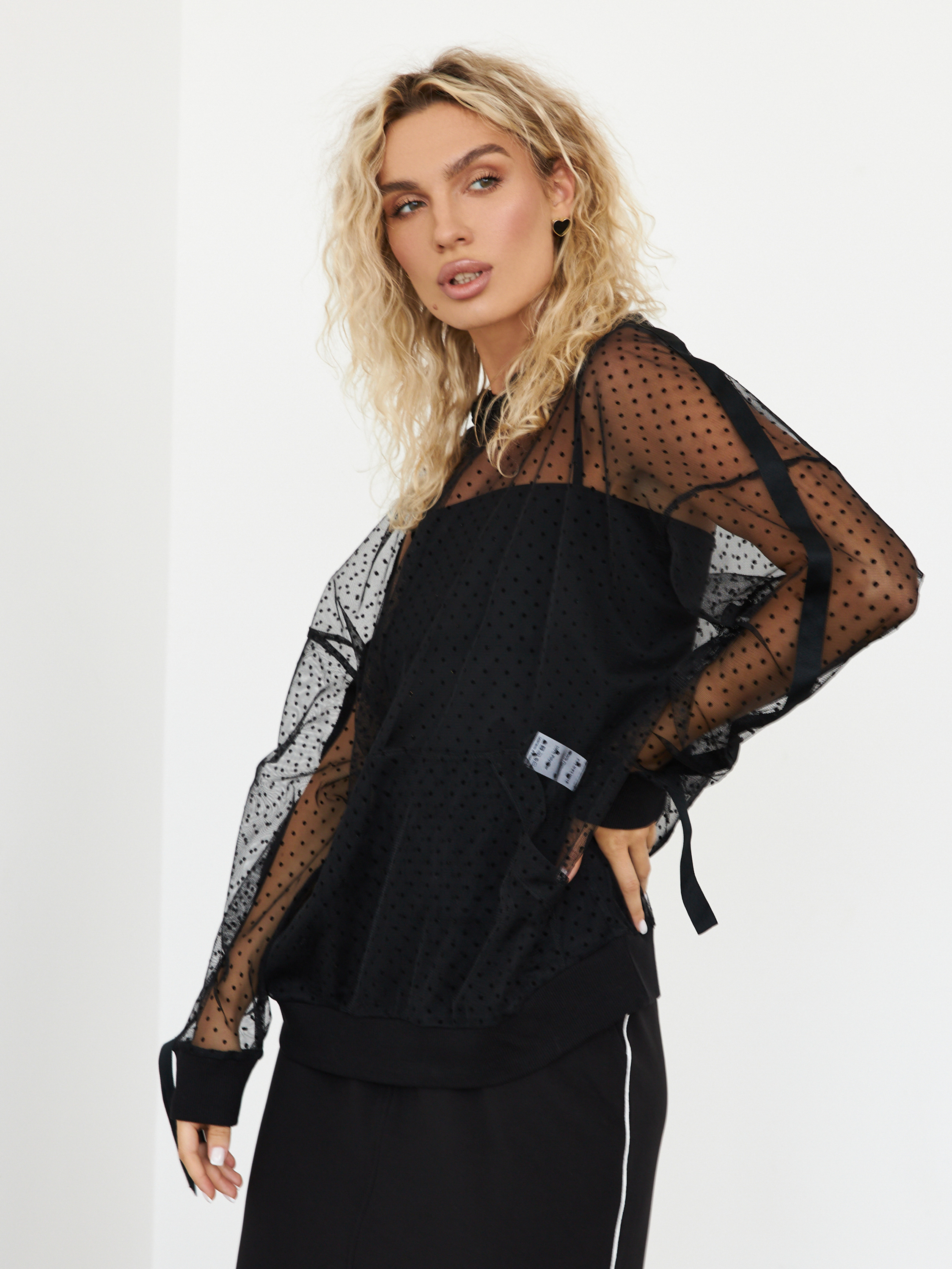 Худи из сетки свободного кроя оверсайз из мягкой дышащей, невесомой ткани сетки. Изделие декорировано черными лентами по длине рукава, карманом кенгуру и мягкими резинками по манжету и подолу. Есть капюшон, двойной. Основное полотно изделия идет в "мелкий горох, черного цвета". При желании изделие можно носить на топ, футболку, рубашку, лонгслив. Универсальная базовая вещь гардероба идеально дополняющая образ. Свободный крой позволяет комбинировать худи c другими элементами одежды