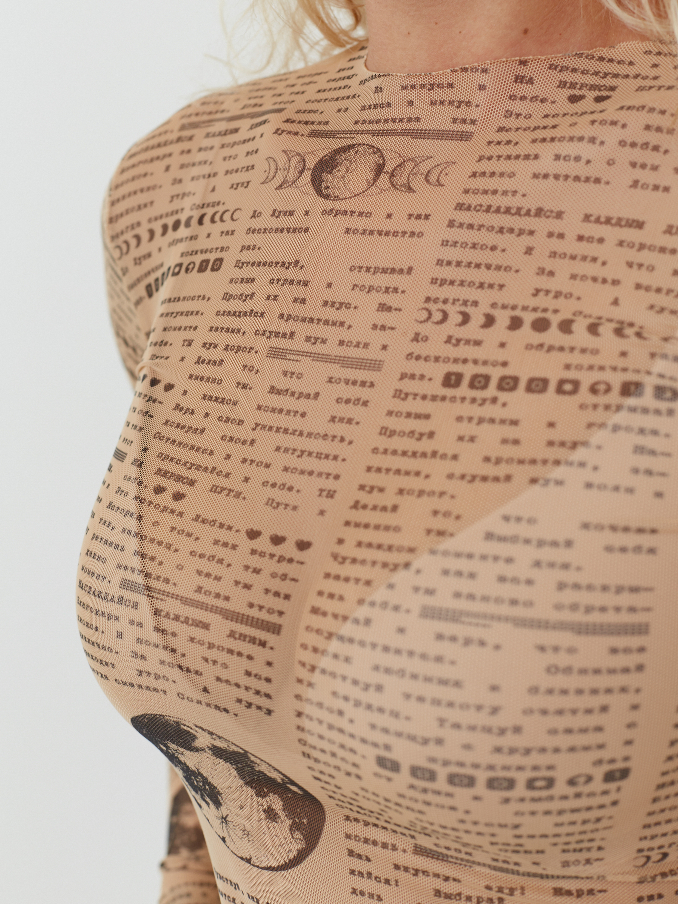 Лонгслив вторая кожа из сетки с авторскими надписями . Круглый вырез под горло с необработанным краем. Длинные рукава. Края изделия не обработаны. Лонгслив можно носить с джинсами и шортами, юбками и леггинсами. Это универсальная вещь, которая должна быть в арсенале каждой современной девушки.