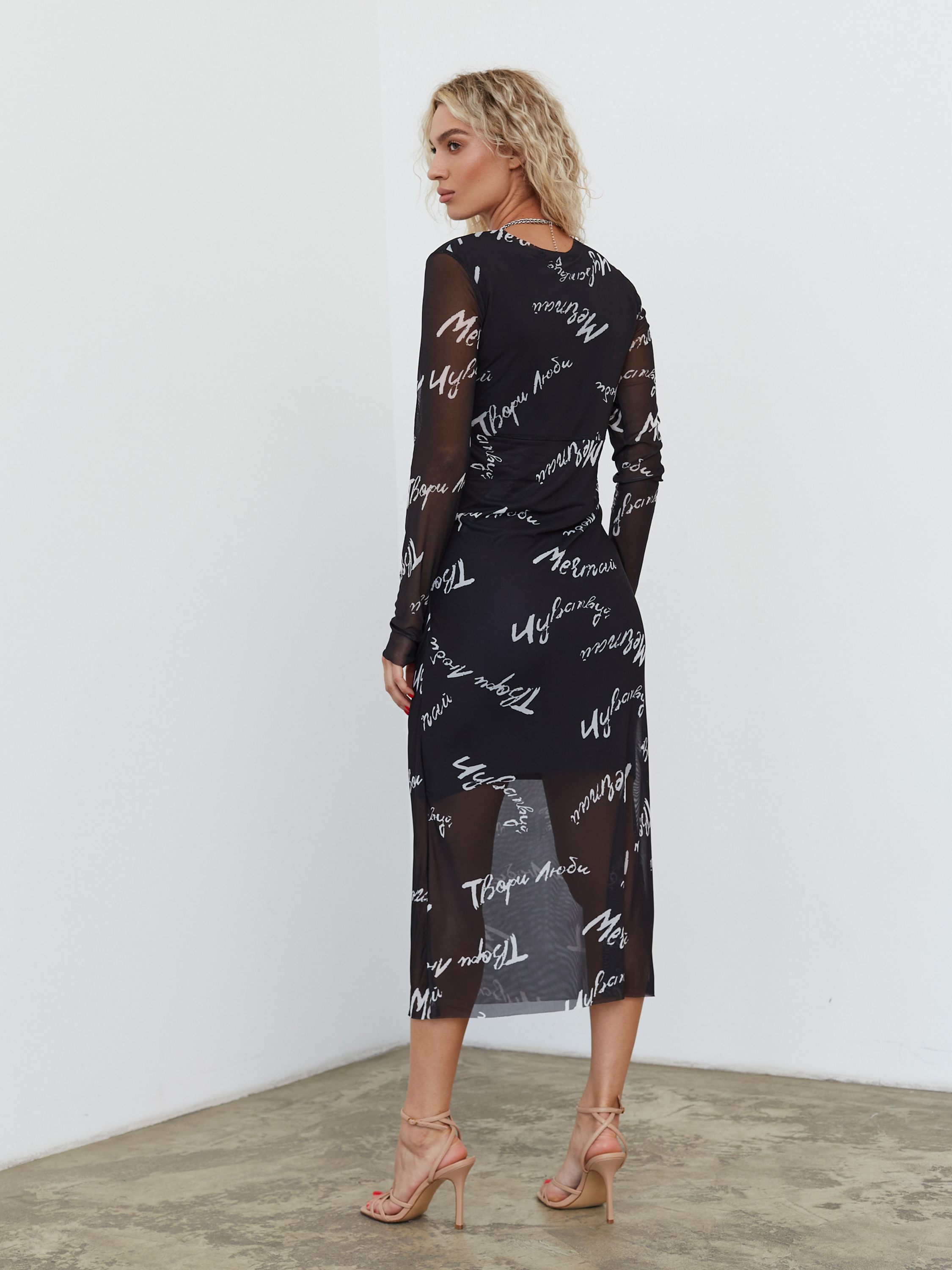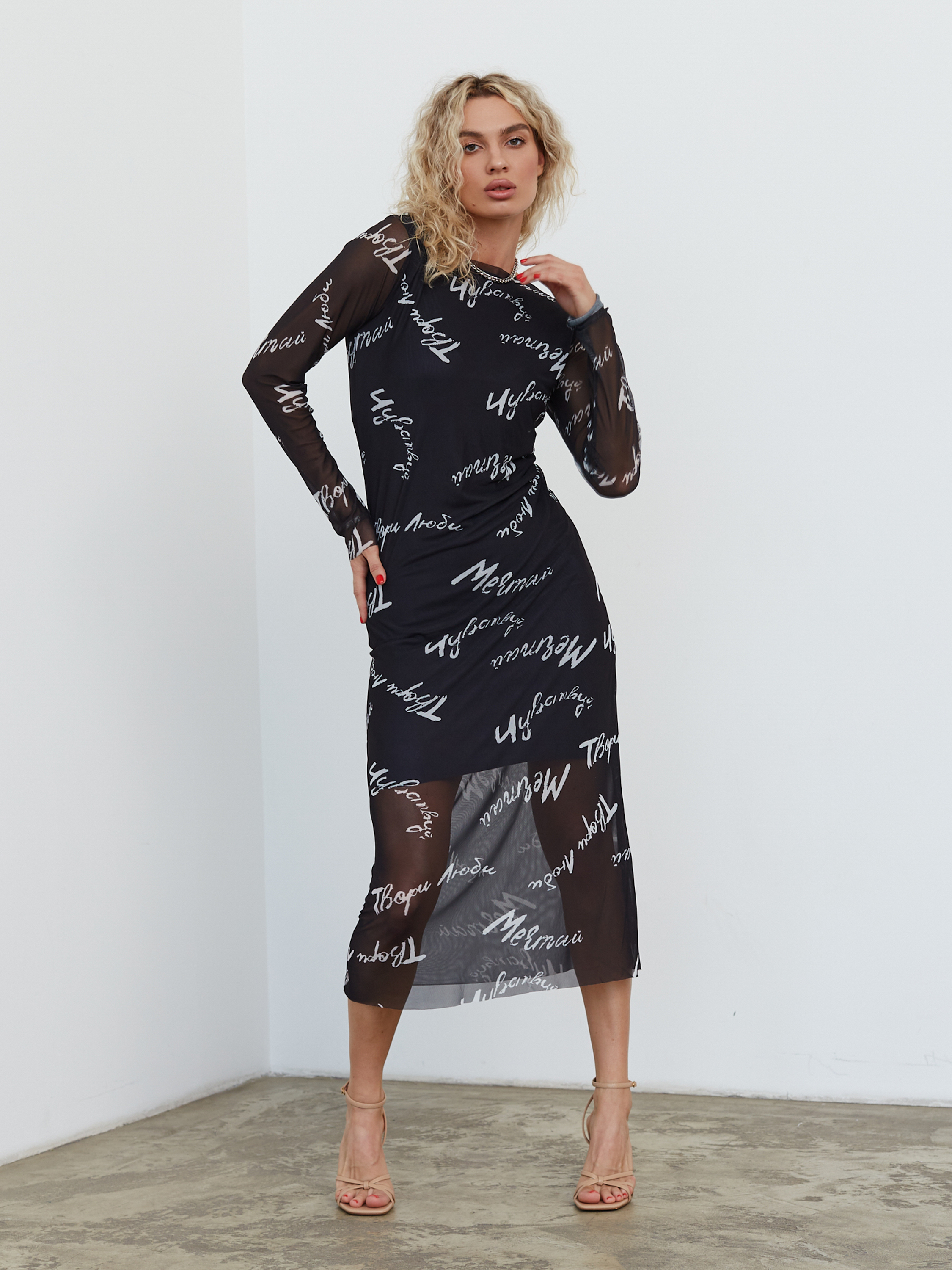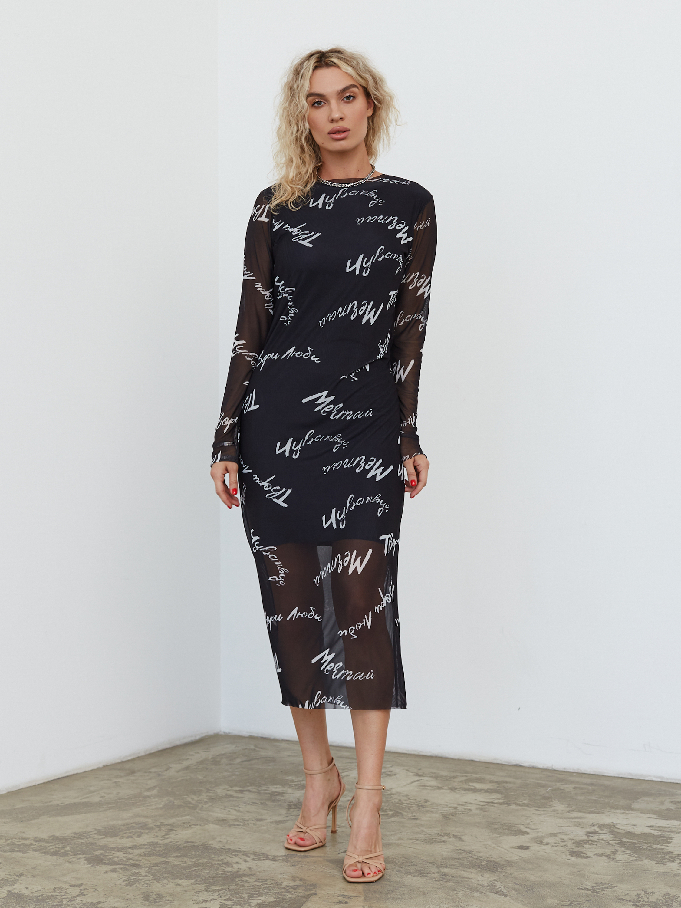 Платье из нежной сетки, на подкладе ( 50% вискоза, 50% полиэстер). Верхний слой выполнен из синтетического волокна (100% полиэстер).