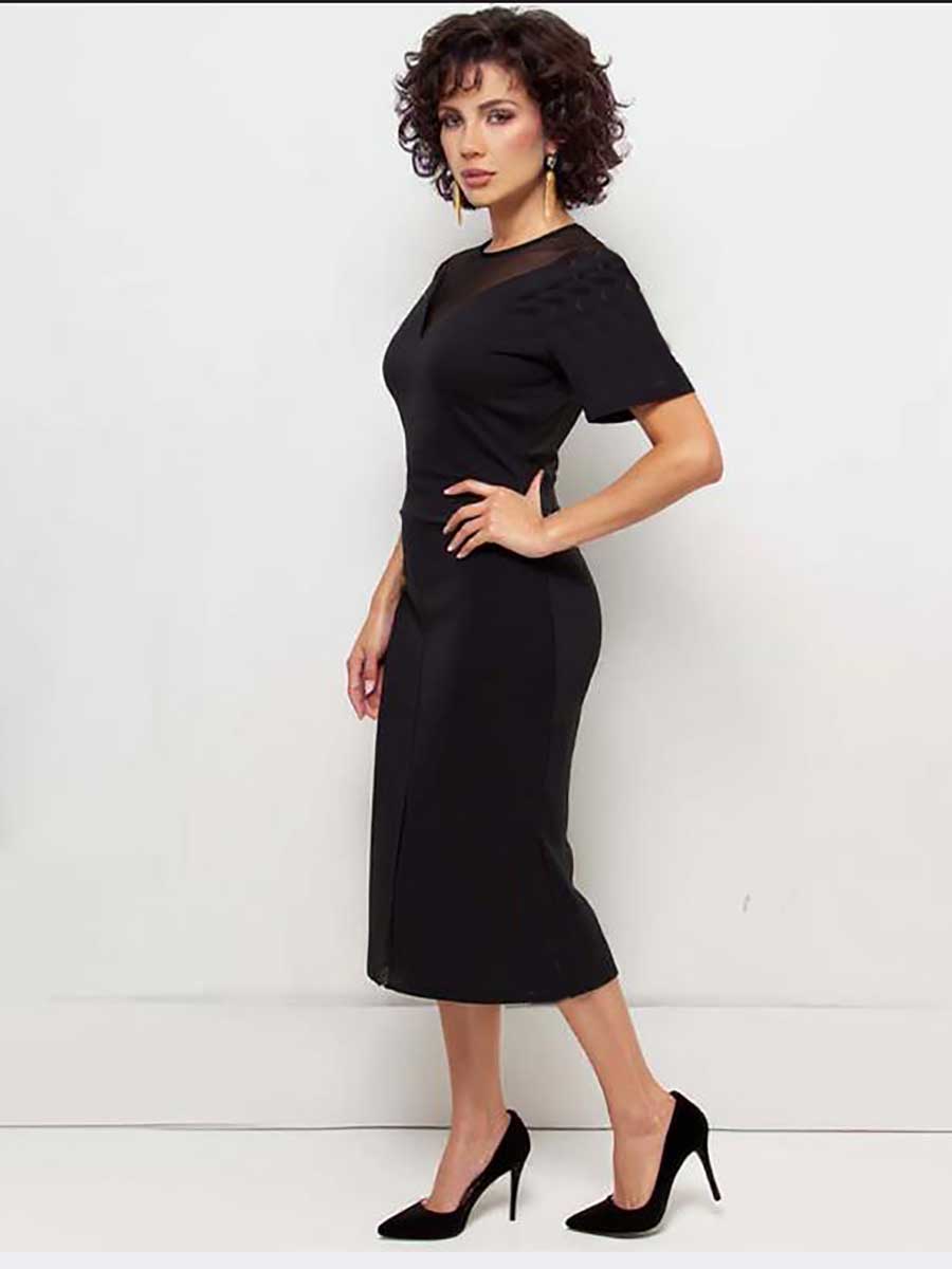 Трикотажное обегающее платье длиной миди с разрезом сзади, с декоративной V образной вставкой на груди из прозрачной сетки.